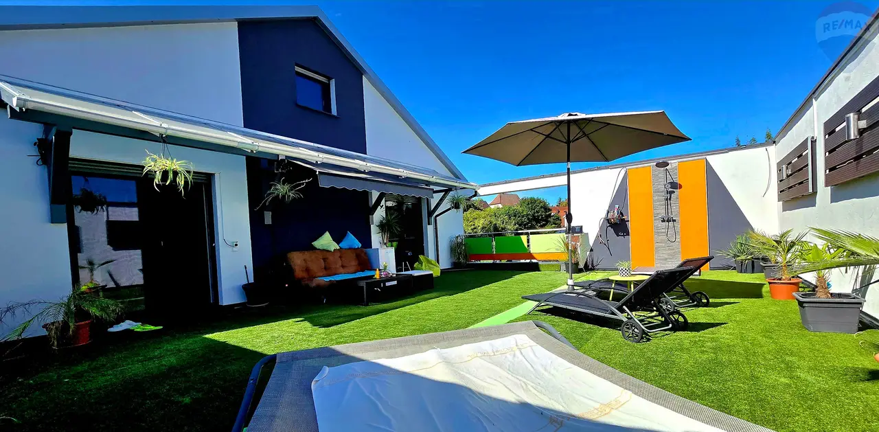 Es gehört ein umzäunter Garten dazu aber besonders hervorzuheben ist die große Terrasse mit einer Fläche von 75 m², die zum Entspannen und Genießen einlädt. Ein zusätzliches Highlight ist die moderne Außendusche, sie verspricht im Sommer spritzige Abkühlung und rundet das Angebot ab.