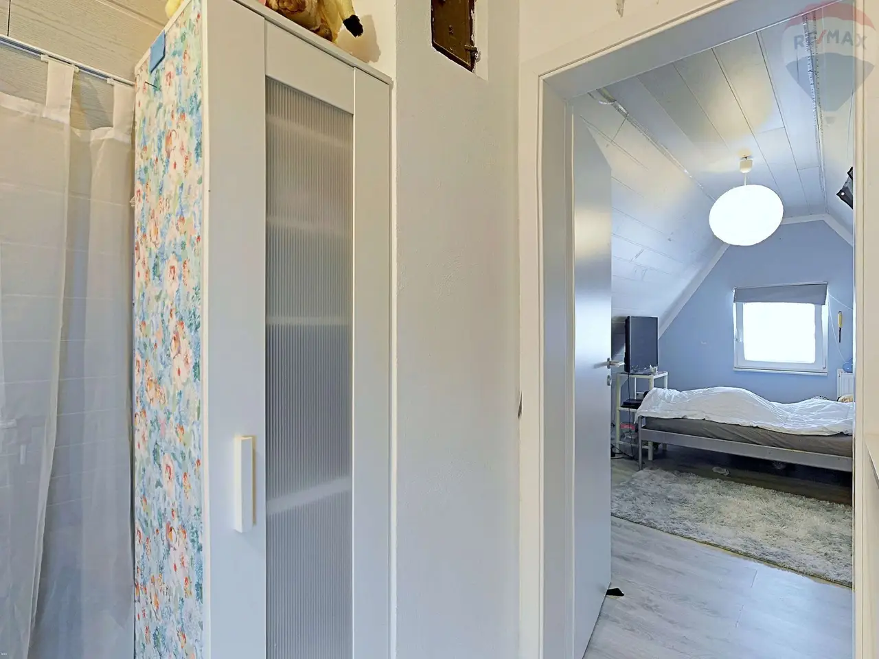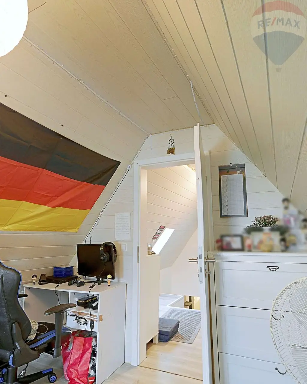 Das Haus verfügt über drei Zimmer, Küche und Bad, verteilt auf zwei Etagen. Im Obergeschoss finden Sie zwei gemütliche Schlafzimmer, die durch einen kleinen Flur getrennt sind, was für Privatsphäre und Ruhe sorgt.