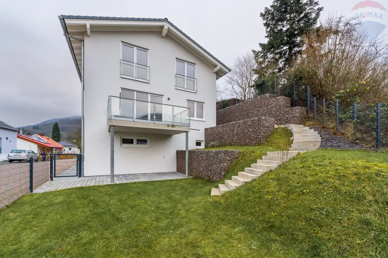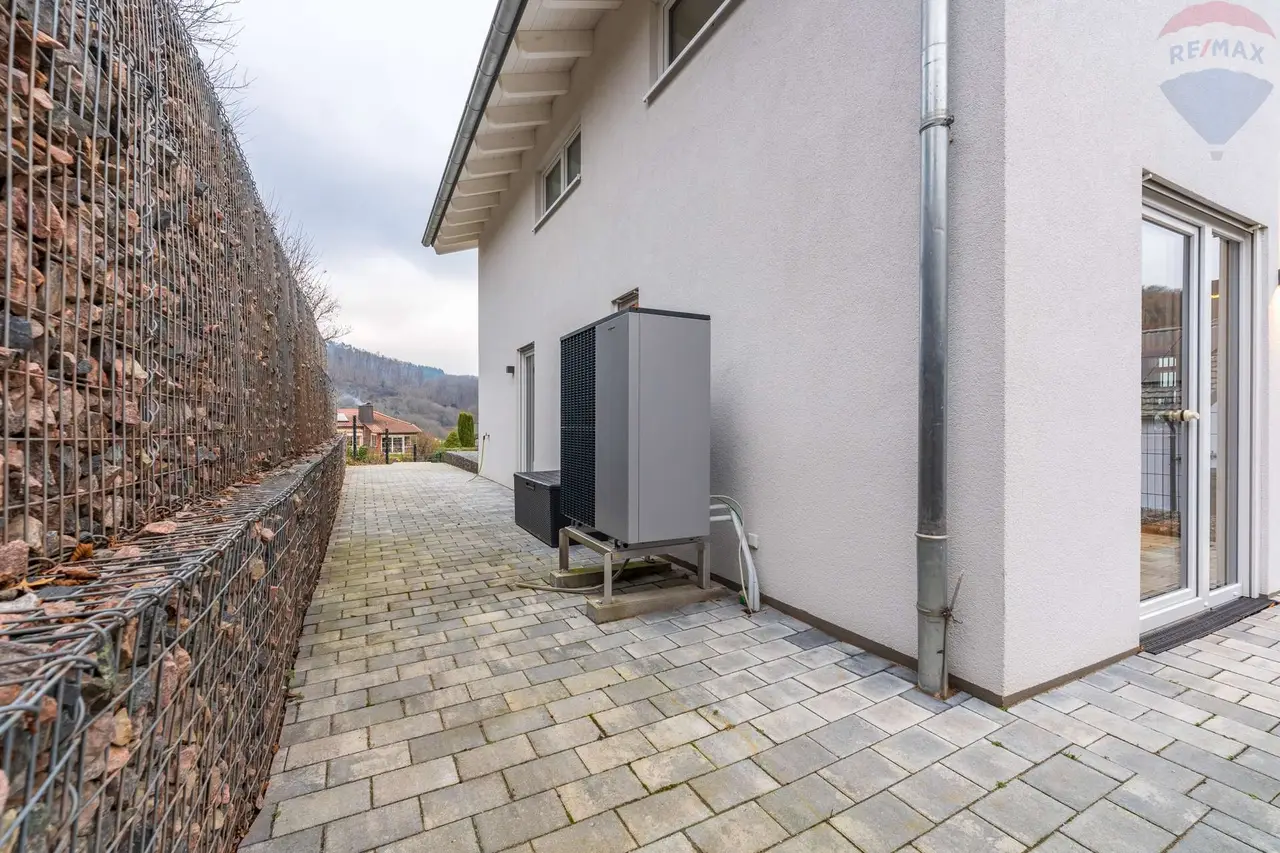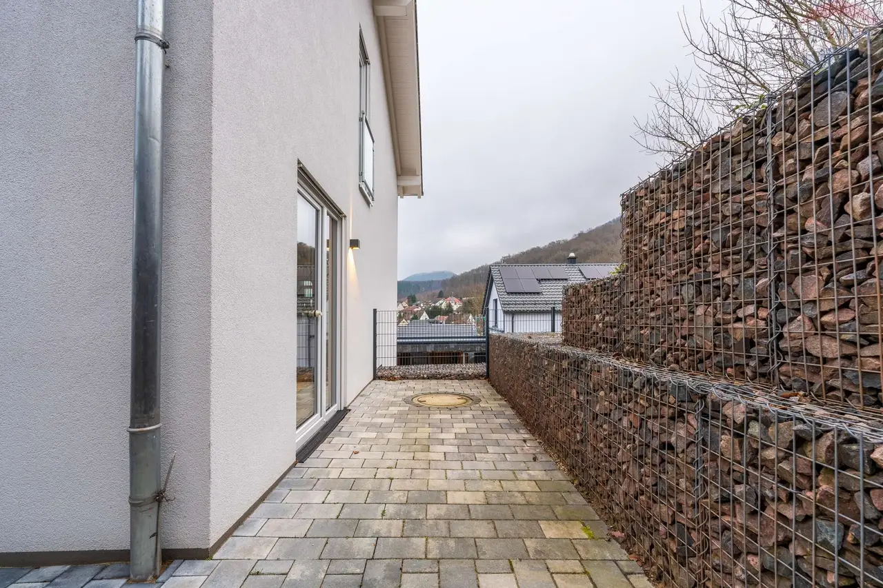 Die Terrasse lädt bei schönem Wetter zum Entspannen und Verweilen ein. Das Grundstück besticht durch seine Hanglage, die optimal genutzt werden kann. Die Hangfläche wurde mit Gabionen professionell abgefangen, um Stabilität und Struktur zu gewährleisten. Das moderne Pflaster und die Rasenflächen verleihen dem Außenbereich ein modernes Aussehen passend zum Haus. Dank der ruhigen Lage können Sie hier die Natur und die schöne Umgebung, mit direktem Blick zur Burg genießen.