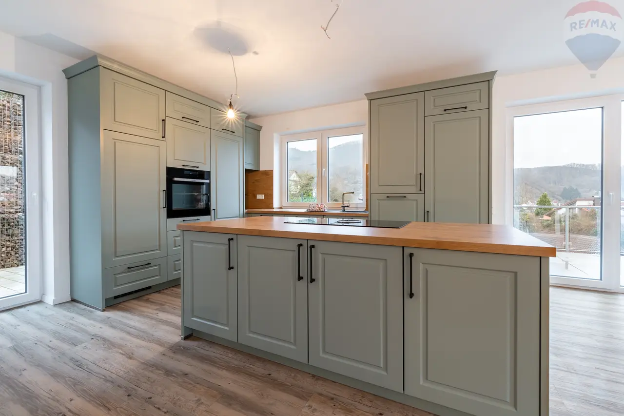 Im Erdgeschoss befindet sich die offene Küche mit einer modernen Einbauküche im Landhausstil, die im Kaufpreis enthalten ist. Außerdem befindet sich hier ein praktischer Abstellraum und der großzügige, helle Wohnbereich mit einem hochwertigen Pellet-Ofen, der für Wärme in den kalten Monaten sorgt. Ein Gäste-WC mit Dusche ist ebenfalls in dieser Etage.