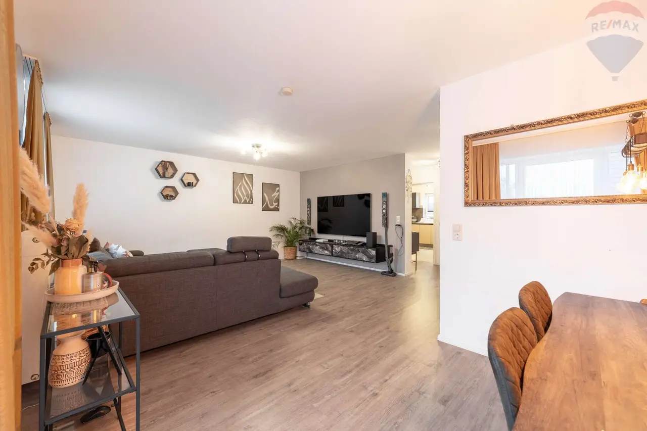 Bereits beim Betreten der Wohnung empfängt Sie ein heller Flur, von dem aus Sie direkt ins großzügige Wohn- und Esszimmer gelangen. Die großen Fenster und der Zugang zum sonnigen Balkon sorgen für eine gemütliche Atmosphäre – perfekt für gemeinsame Familienabende oder entspannte Stunden mit Freunden.