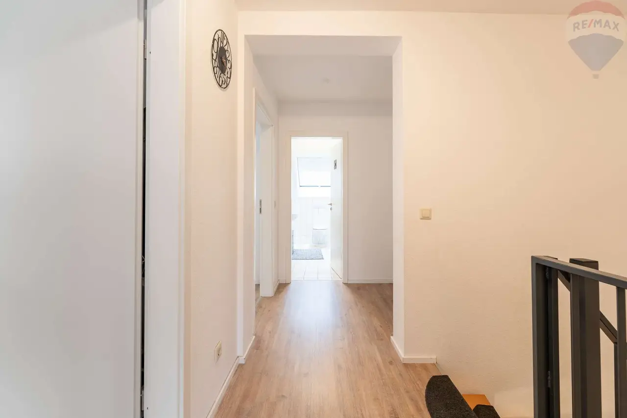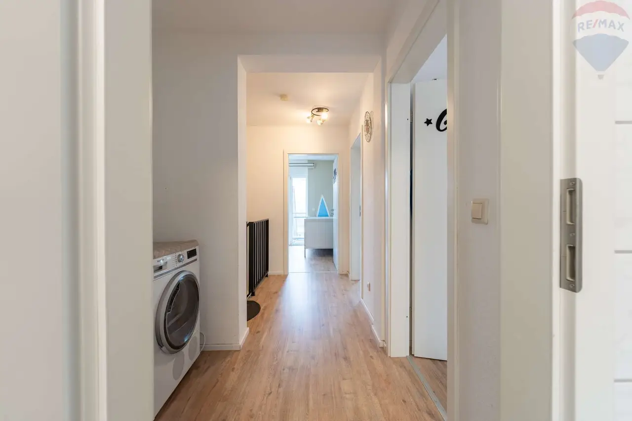 Ebenso auf dieser Etage: ein praktisches Gäste-WC, ein Abstellraum sowie ein weiterer Balkon, der das Wohngefühl perfekt abrundet.